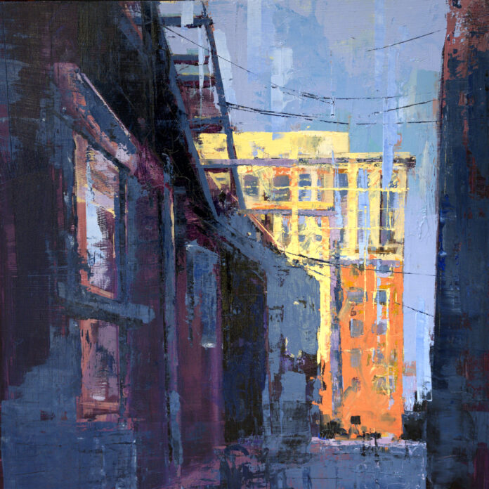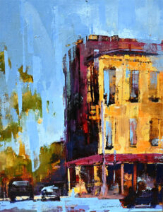 The shapes, colors, and shadows of buildings in this West Chester alley create an intriguing composition. I enjoy using a palette knife to layer vibrant colors over the base paint.