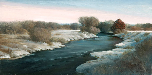 Lead Image: “February 23rd on the Sugar River at Sunset Farms,” by Jan Norsetter, 2013, oil on panel, 8 x 16 in.