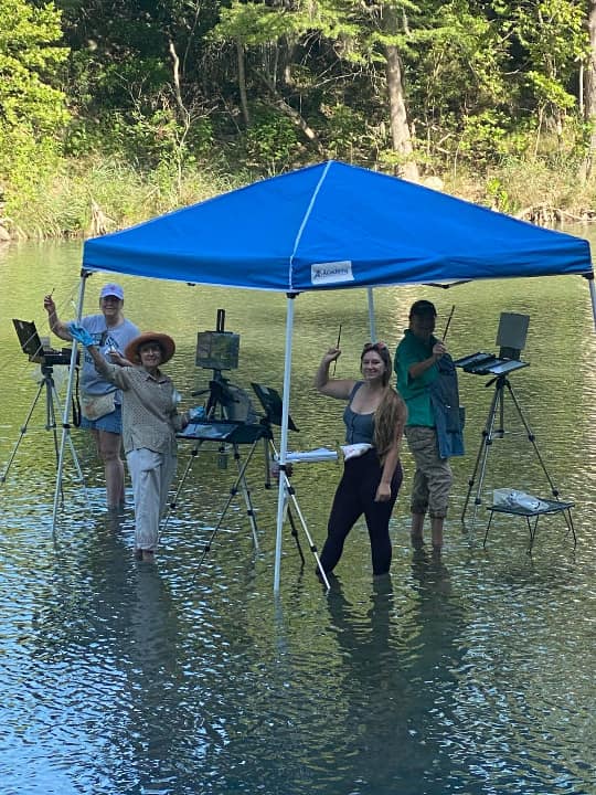 “When it’s 105 degrees outside, we found a way to stay cool while painting,” said artist Sherry Lutz Wooley. “I sat up a canopy in the Guadalupe River for our Texas Hill Country Plein Air Painters. Some beautiful paintings resulted, with the play of light down on the river.”