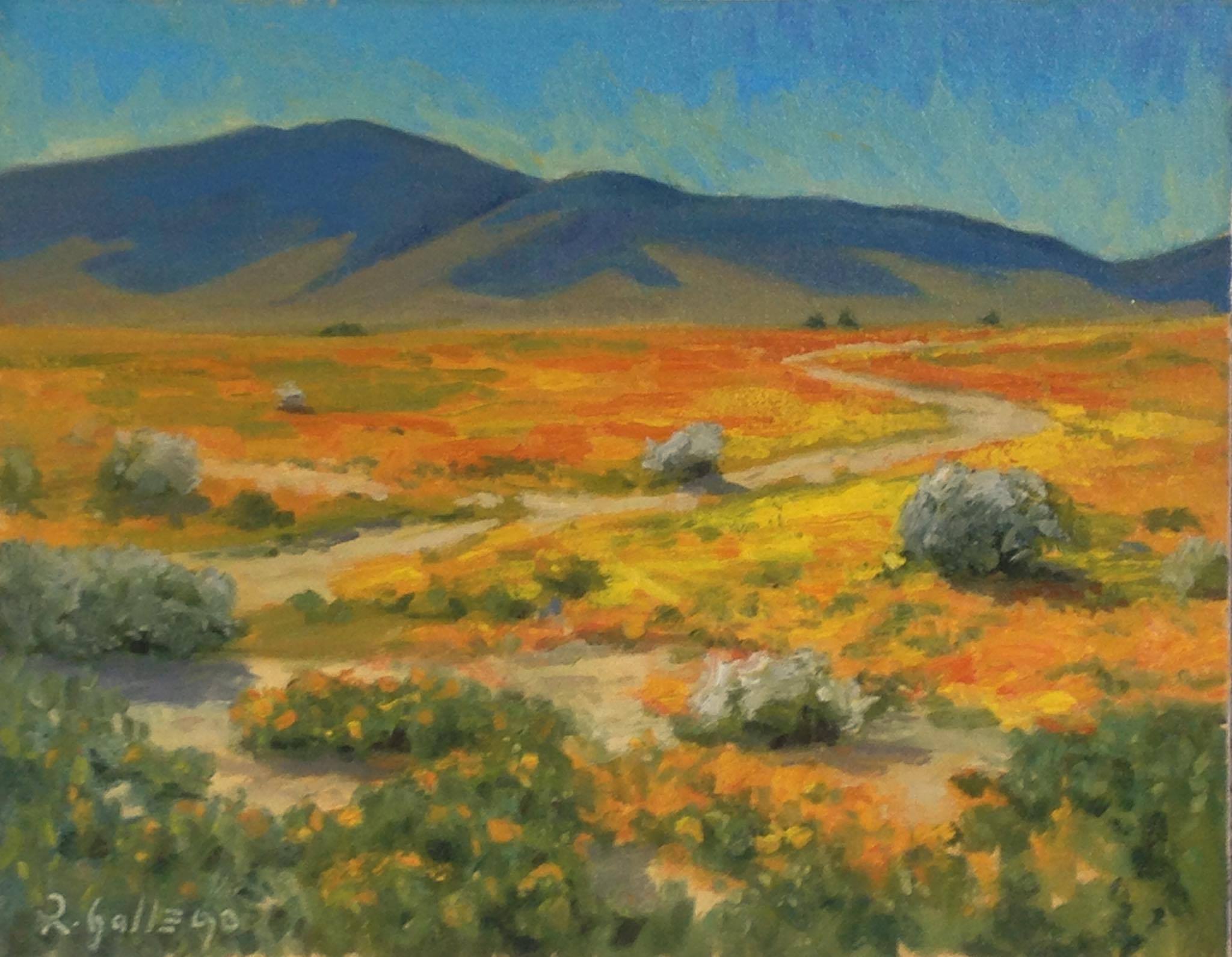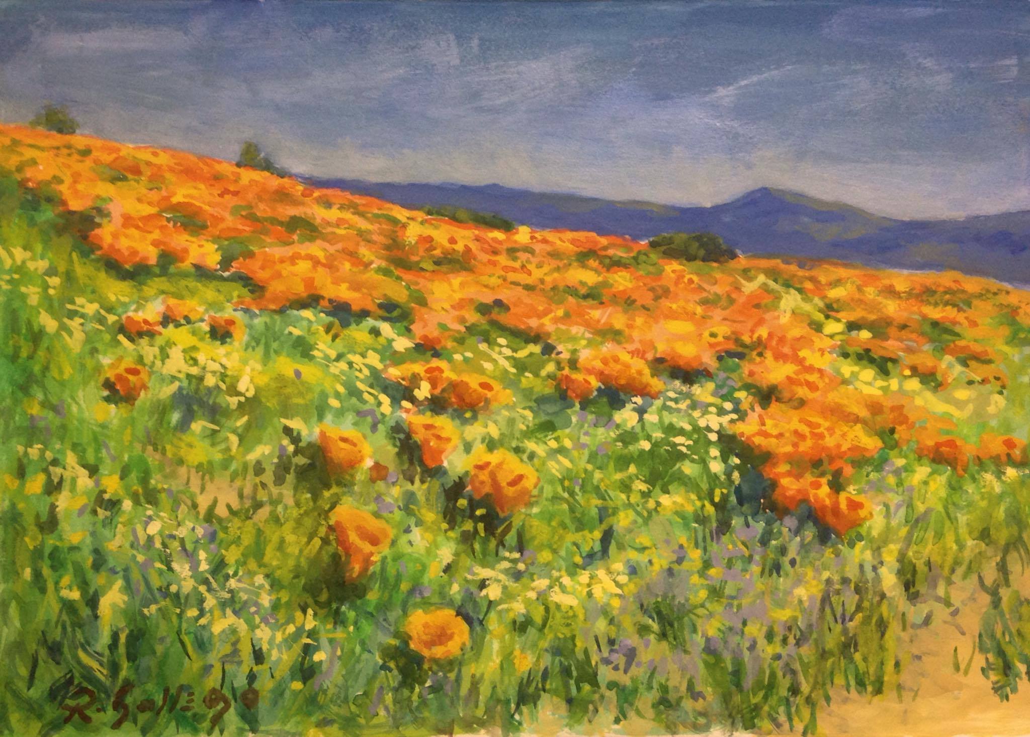 Terry d. Chacon has been enjoying the blossoms as well, and painting plenty of pieces to document it. “Much to my surprise, the blooms started a little more than a month ago in the Lake Elsinore area,” she says. “The blooms stopped traffic, and the traffic jams were up to two hours long to get through on a very busy Interstate 15. The blooms are good up in the Lancaster area but not as good as I have seen them before the drought, but I believe they will be going on until the end of April, so we may see more pastures of orange poppies than what we see now.
