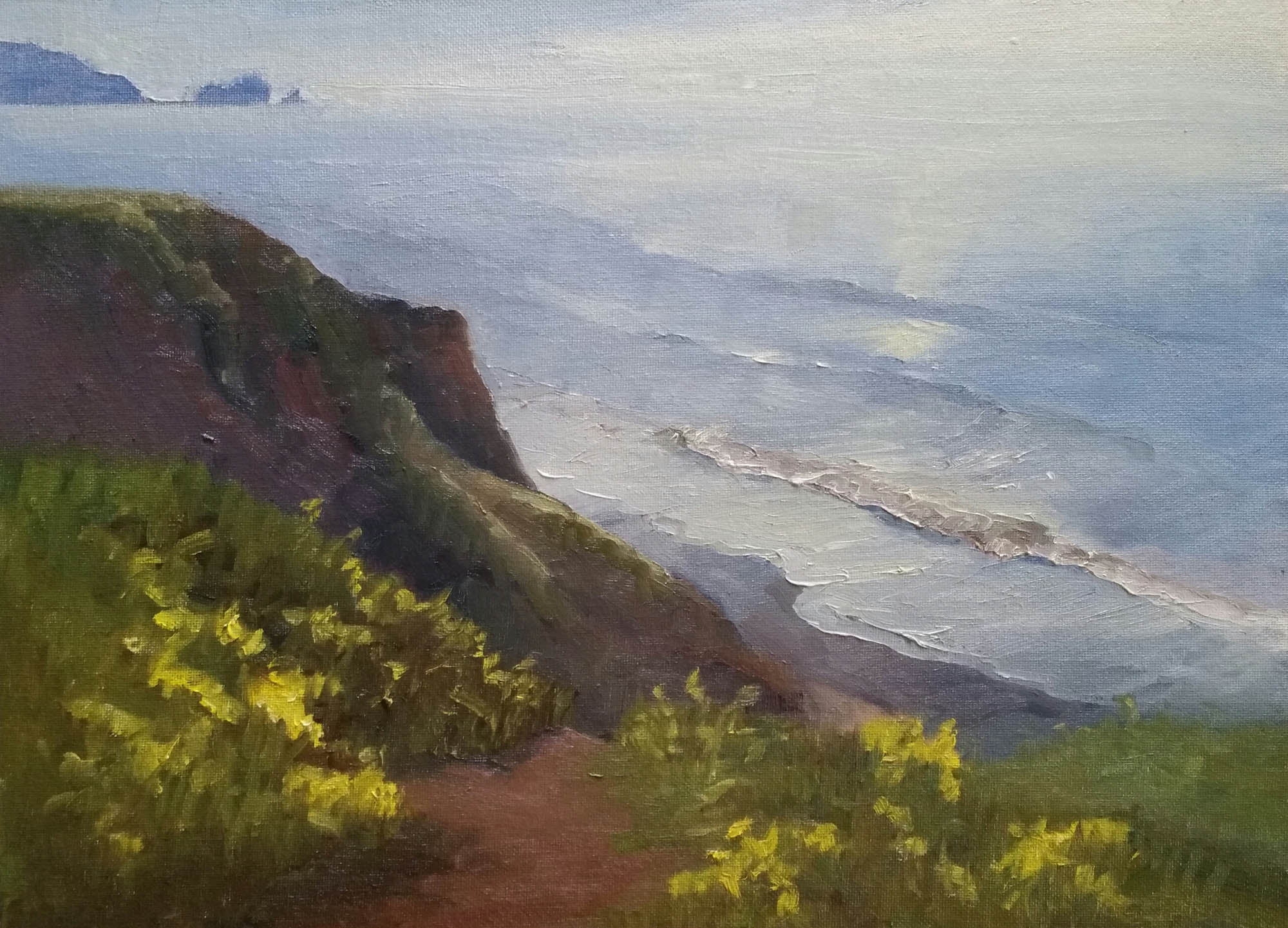 Finally, further up the coast, one last report. “I paint in Pacifica, and there the cliffs are covered in wildflowers,” says Catherine Fasciato. “I thought the Bermuda buttercups looked like shamrock, so I named my painting ‘Below the Shamrock.’ I painted two others on Mt. Diablo, near where I live. Every spring the California poppies explode on the slopes there. It is quite a sight.”