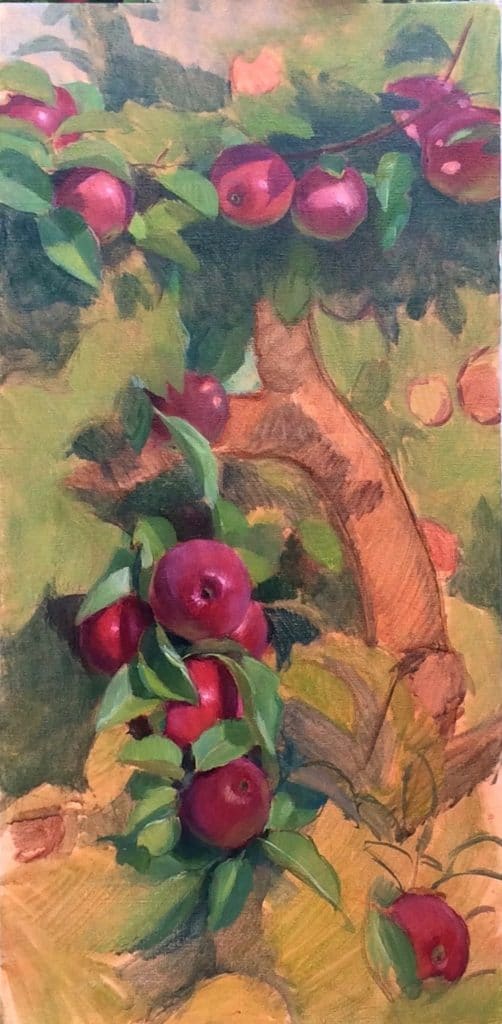 Facebook followers were amazed by the sequence of photographs Stephan Giannini posted that documented the slow, steady progress of a 16 x 12-inch painting of apples hanging on a tree. The artist worked on that plein air piece for five hours every day, over a total of six or seven days. His online friends were surprised that each time he posted photographs of the carefully rendered surface, he commented that he still had a long way to go to resolve his studies. Many said they would have gone home completely satisfied after one five-hour session of work, especially since the subject was one that could have been painted with a few bold strokes of oil color.