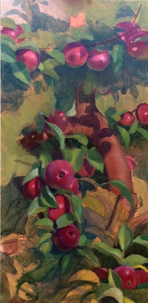 Giannini’s Facebook friends were even more surprised when he followed that first effort by creating an even larger (30 x 14-inch) plein air work of another group of hanging apples. There was no question that both paintings were stunningly beautiful and presented apples in ways few would have considered. He showed familiar objects in a completely new way and, in the process, asked observers to reconsider what they know about the fruit. The paintings were clear evidence that by taking a careful, thoughtful, sensitive approach to presenting a truth about nature, Giannini was identifying plein air painting as a means of achieving another level of expression.